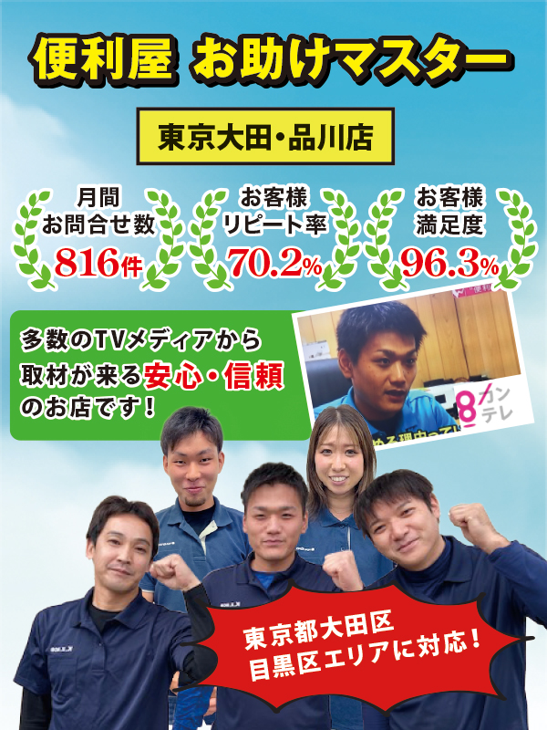 この度は便利屋お助けマスター東京大田・品川店にご来店いただきまして誠にありがとうございます。当社では「格安」を売りにしているわけでは無く、決して大手の便利屋さんでもありません。しかし、そんな中当社をお選びいただけたお客様には必ず「選んでよかった」 と言っていただけるサービスのご提供をお約束いたします。